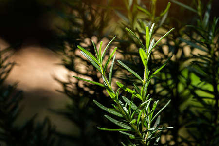 Fresh Rosemary Herb grow outdoor. Rosemary leaves Close-up.