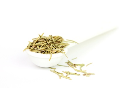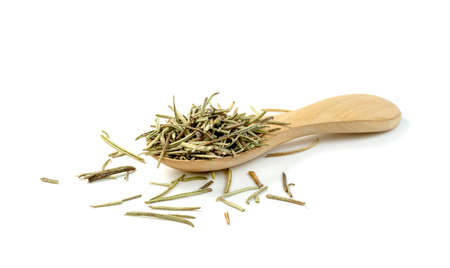 Dry rosemary in wooden spoon isolated on white background