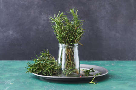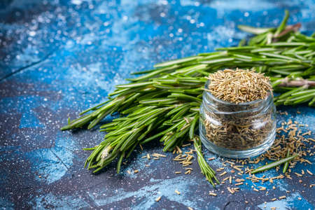 branches of fresh rosemary, dried rosemary in a glass jar on a dark blue background , selective focus