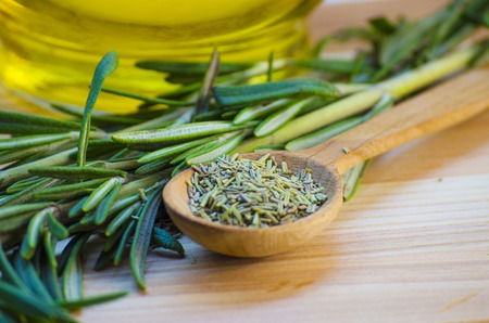 fresh and dried, ground rosemary on a wooden board and its oil