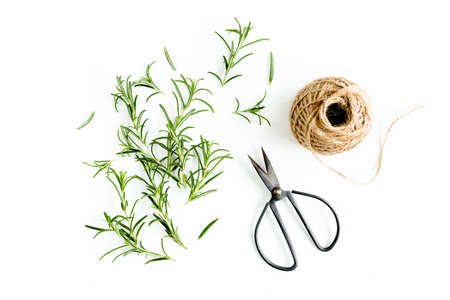 Closeup of fresh rosemary herb branch with craft rope isolated on white table background. Healthy food. Culinary, gardening concept. Rosmarinus officinalis green aromatic leaves. Empty copy space.