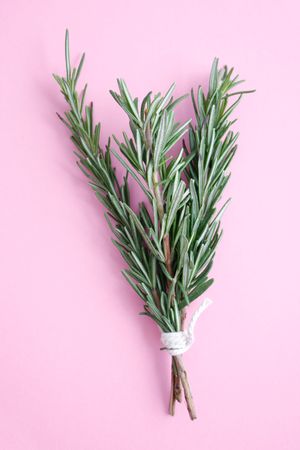 bundle of sprigs rosemary tied with string on a dark mirror background.