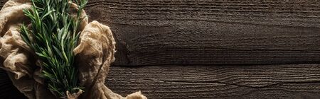 top view of green rosemary in rustic cloth on wooden weathered table with copy space, panoramic shot