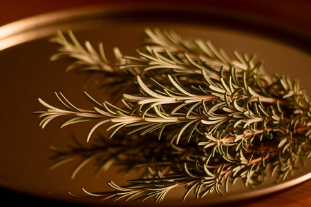sprig of rosemary on a dark mirror background.