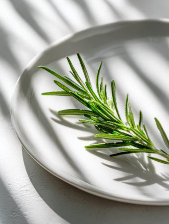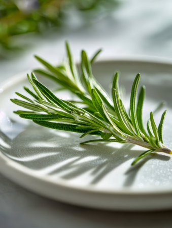 A vibrant green rosemary sprig rests on a clean white ceramic dish, illuminated by gentle natural light that casts subtle shadows and emphasizes its slender, needle-like foliage.