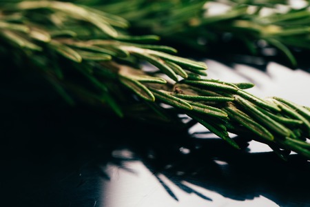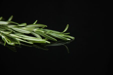 bundle of sprigs rosemary on dark mirror background close-up.