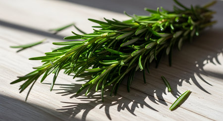 A lively green rosemary branch with slender, fragrant needles creates delicate shadow patterns on a rustic ceramic plate illuminated by soft daylight.