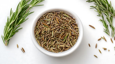 Overhead shot displays dried rosemary leaves in a white bowl surrounded by fresh rosemary branches, all lying on a clean white surface.