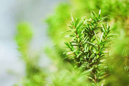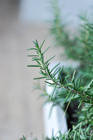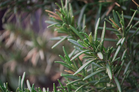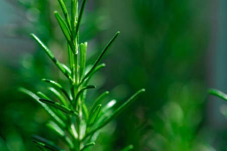 Close up of the branch of green Rosemary Plant color with a blurred background. Macro rosemary plant with selective focus