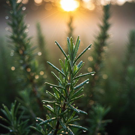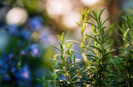 A close-up shot showcases a rosemary plant with vibrant green leaves, illuminated by soft sunlight. The composition features a shallow depth of field, with a blurred background displaying hints of blue and bokeh effects. This image is suitable for various commercial applications, including culinary, health, and wellness content.
