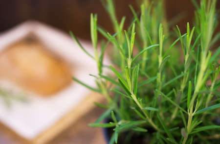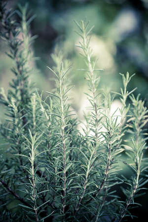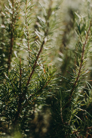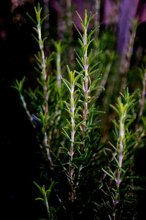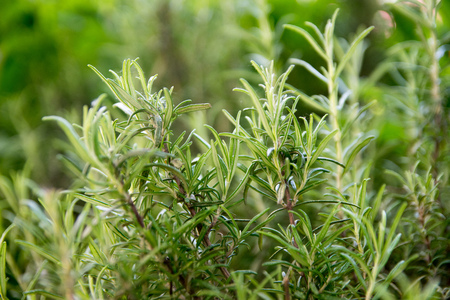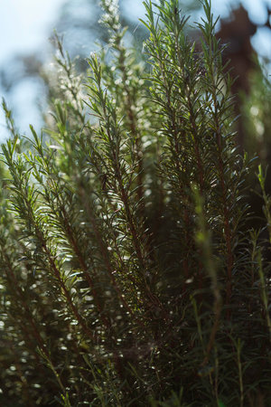 Close-up fresh organic Rosemary herb grow outdoor. Aromatic and medicinal PIanta. Healthy, natural condiments for cooking, making a honey Bio ingredients for cosmetics,