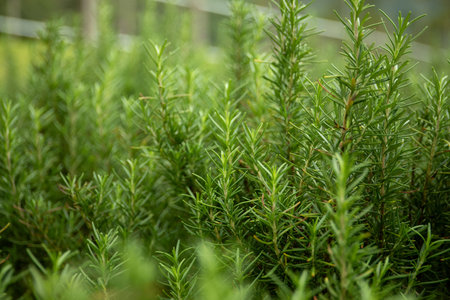 Organic food. Bright green rosemary bush grows in natural open-air environment