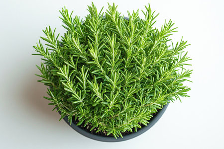 Potted rosemary plant with needle-like leaves on a white background. Herb with aromatic leaves in pot. Top view.