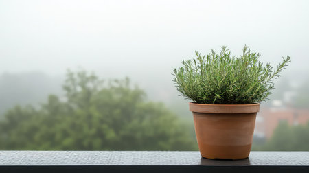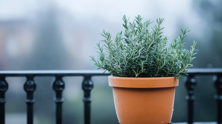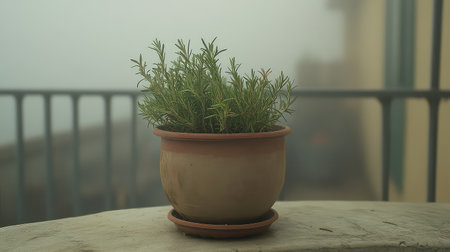 A serene potted rosemary plant sits on a balcony railing, surrounded by a soft foggy backdrop. This image captures tranquility and natural beauty in morning light.