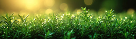 A panoramic wide view of Rosemary garden growing closely together at dawn gentle morning light illuminating fresh leaves ultra realistic photography cinematic wide composition lifelike natural scene