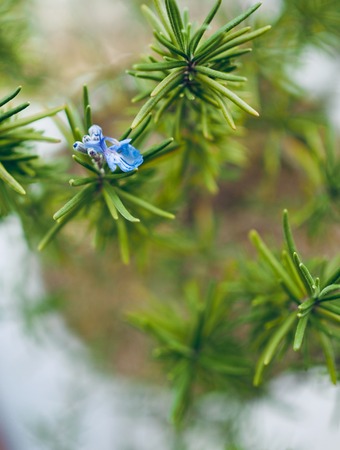 Green rosemary plant with lilac flowers, aromatic kitchen herb
