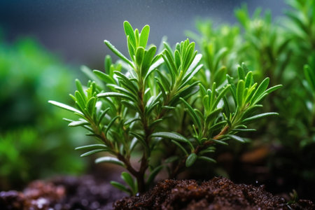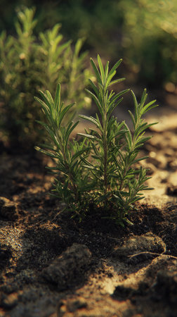 Rosemary with small fresh leaves, growing upright in fertile soil, sunlight filtering gently, realistic textures, vibrant green tones, natural photography style, wide balanced composition