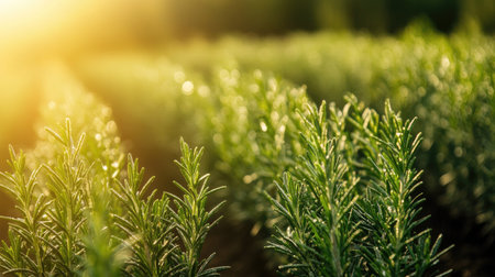A close-up view of vibrant green rosemary plants basking in sunlight. The image captures the essence of nature and sustainable agriculture in a serene field.