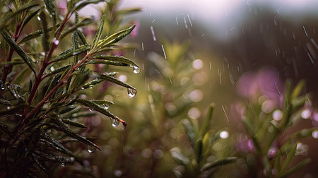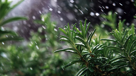 Rosemary in a storm, heavy rain pouring down, strong winds twisting their leaves, natural.