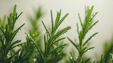 A close-up of fresh rosemary sprigs with dew drops, showcasing its vibrant green color and fragrant texture against a white background