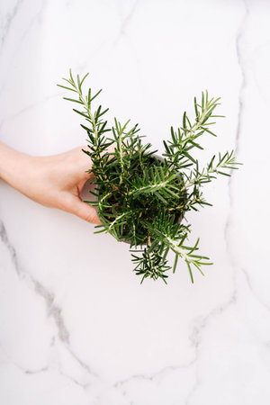 Green fresh rosemary seedling in hand top view. Female holding herb houseplant in pot. Woman holding flower pot in hand on white marble background. copy space