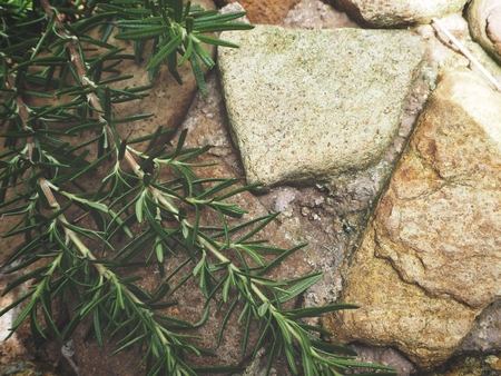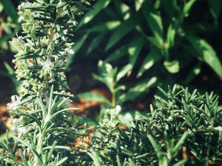 Sprigs of aromatic rosemary in the garden on a sunlight. Selective focus.