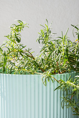 Potted rosemary plant in ribbed light blue ceramic pot close up.