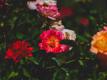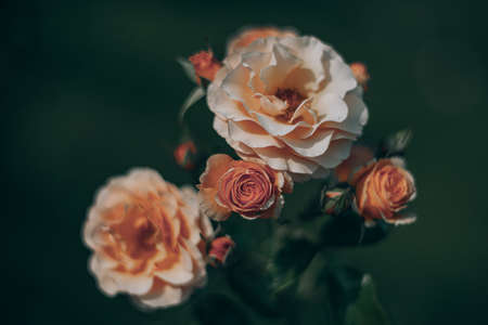 inflorescence of a bush of a rose of coral color on a dark green background. flowers close-up with selective focus.
