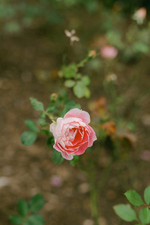 A pink rose blooms amidst greenery, capturing the essence of spring with its soft petals and natural beauty.