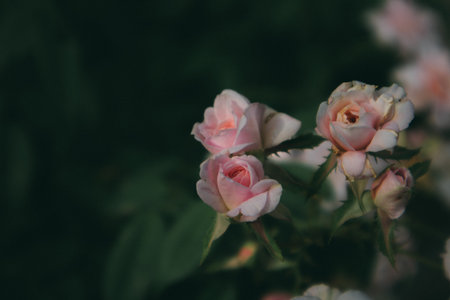 Beautiful pink roses after the rain, dark toned photo, natural background