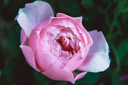 Delicate pink rose with a soft green background. Garden rose in bloom. Pink rose flowers on a shrub in the summer. Rose flower blooms in a garden park.