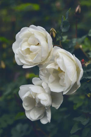 A bush of white roses in summer sunset backlight. selective focus macro shot with shallow DOF.