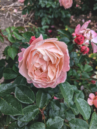 Pink garden rose on a bush in the summer garden. Juicy bright greenery, blurred background. beauty is in nature. A blooming flower.