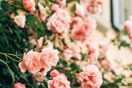 Beautiful bush of pink roses in a spring garden. Flower field. Field of tea rose. Rose garden.