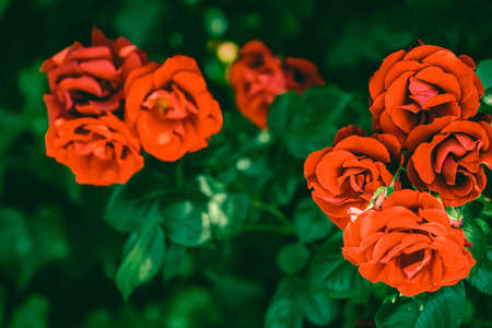 Beautiful bright red rose flowers and buds growing in the garden. summer nature.