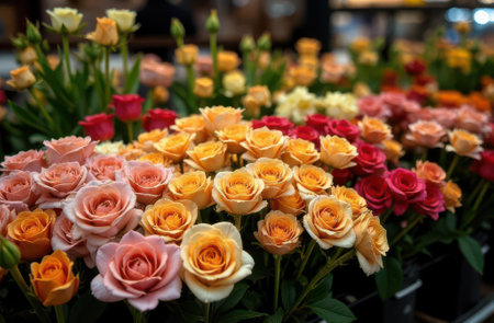fresh roses in a coral-colored pot on the shelf in a flower shop