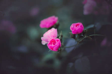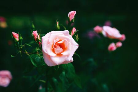 The buds of a beautiful pink rose with delicate petals bloom in the twilight of summer on a bush in the garden. nature and romance.