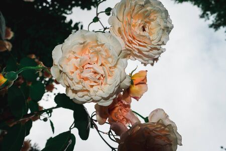 Shrub roses with orange or yellow buds of fragrant flowers against a blue or turquoise sky in a spring or summer botanical garden, rosarium, in a flower bed. beautiful flowers in bloom. Horticulture.