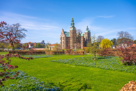 Rosenborg Castle stands majestically in Copenhagen, Denmark, surrounded by vibrant gardens. Visitors stroll through green lawns, enjoying the spring blooms and serene atmosphere.
