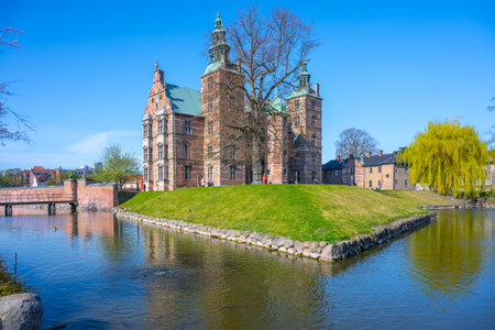 Rosenborg Castle showcases its stunning renaissance architecture in Copenhagen, surrounded by tranquil waters and lush greenery on a bright, clear day with blue skies.