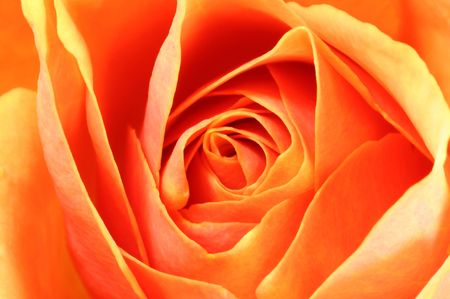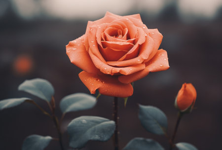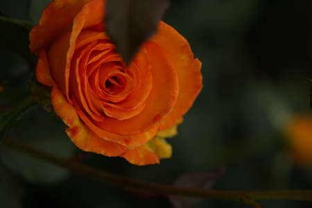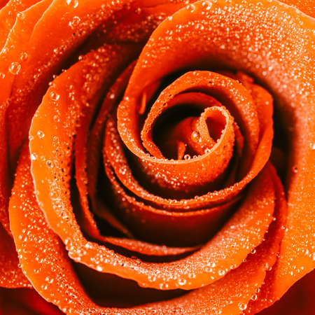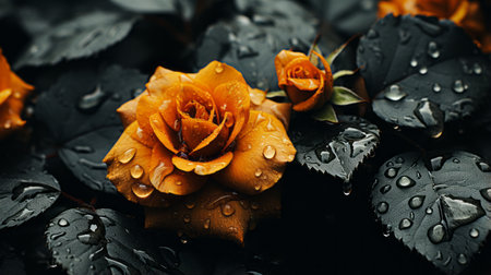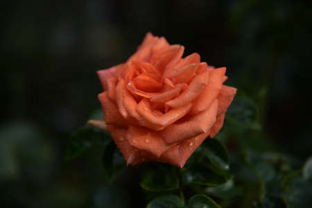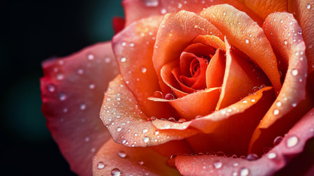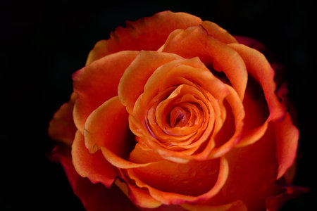 Closeup of a beautiful orange rose with flower petals and water drops in front of dark background