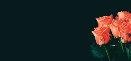 Bouquet of beautiful roses close up on dark background. Abstract backdrop for seasonal cards, posters, blogs and web design. Romantic and love concept. Copy space