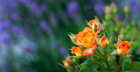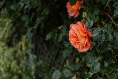 Orange roses on a Bush in selective focus. Beautiful delicate trailing garden roses on a blurred background. A summer of juicy colors. Queen of the garden. The horizontal composition.