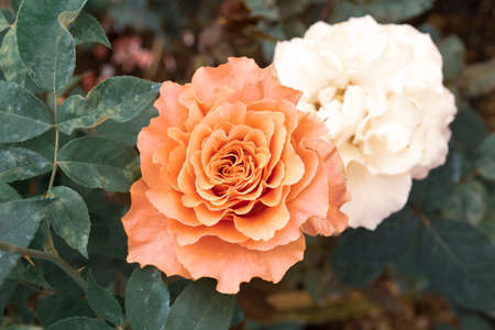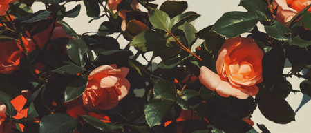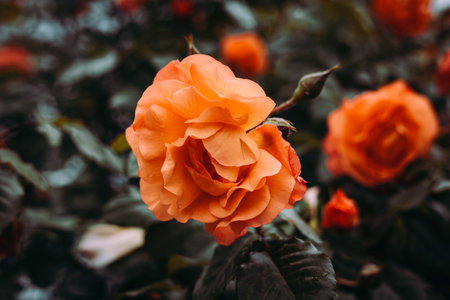 Orange blossoming amongst lush green foliage on a bush in summer garden. Beautiful rose blooms among lush leaves. A touch of floral elegance. Spring.