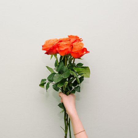 Female hand holds five roses. Tall green stems and leaves. Holiday greeting concept. Flowers as a gift. Front view