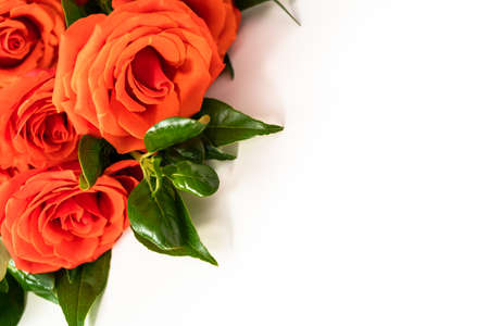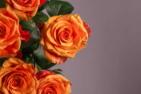 Background of a bouquet of beautiful fresh vivid orange roses tinged with red for celebrating Valentine's, an anniversary, birthday or Mothers Day and free space for text on orange background