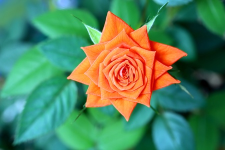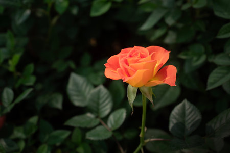 The orange rose unfolds its petals beautifully, brightening up the garden as morning light filters through the leaves.
