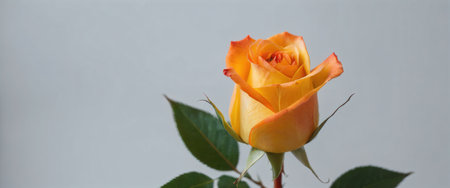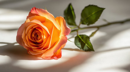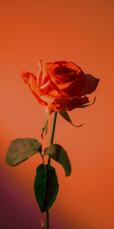 Elegant Single Rose with Lush Leaves Against Warm Background.