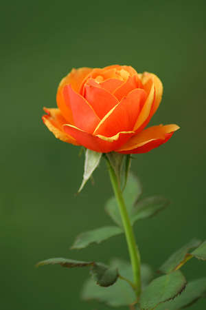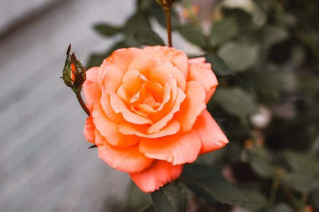 Orange rose bud in full bloom. A single rosebud on a flowering bush in the formal garden. Fragrant aromatic single flower. Gardening, horticulture.