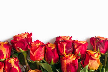 Red and yellow roses isolated on white background. Flat lay, top view, free copy space.
